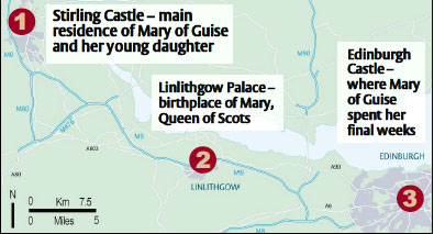 Marie de Lorraine, qui en 1538 avait remplacé la princesse et reine consort Madeleine, fille du roi François Ier, possédait plusieurs résidences en Écosse, notamment Stirling castle et le palais de Linlithgow, où est née en 1542 sa fille Marie. La même année, Marie de Lorraine perdait son jeune époux, Jacques V d’Écosse, de la famille des Stuart. Après son voyage en France en 1550-1551, le retour en Écosse est difficile. Marie passe les dernières semaines de sa vie enfermé au château d’Edimbourg, où elle meurt en juin 1560.