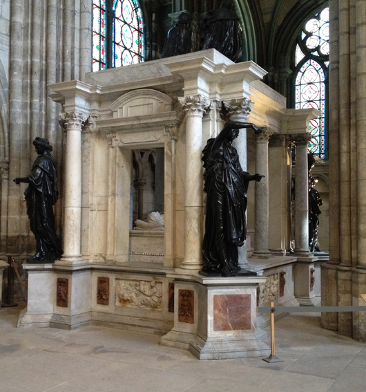 Dans la nef de la basilique de Saint-Denis, les visiteurs peuvent admirer trois mausolées grandioses du 16ème siècle : celui de Louis XII et d’Anne de Bretagne, celui de François Ier et de Claude de France, puis celui d’Henri II et de Catherine de Médicis. Ce dernier a traversé cinq cent ans quasi intact et a même survécu aux destructions de la Révolution Française. Une gravure d’Israël Sylvestre vers 1620 montre la disposition du tombeau : on constate que hormis les deux autels disposés devant le couple royal agenouillé en prière sur la plateforme, les transis à l’intérieur ainsi que les sculptures des vertus cardinales aux angles, sont toujours en place.