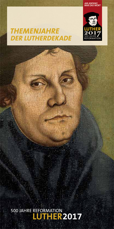 Deux ans plus tôt naissait dans cette même ville de Wittenberg un petit garçon, Lucas Cranach, fils de Barbara Brengebier et de Lucas Cranach, plus tard appelé Cranach l’Ancien, artiste célèbre de la Renaissance allemande. L’enfant deviendra peintre comme son père, qui peignait le portrait de Luther ci-dessus sur l’affiche de l’année Luther 2017. La peinture sur bois date de 1529 et représente le jeune Luther à côté de sa femme Catherine Bore. Nonne avant de s’enfuir de son couvent, elle trouva secours à Wittenberg chez les Cranach, où elle rencontra Luther. Le double portrait du couple – un ex-moine et une ex-nonne tout de même – est aujourd’hui conservé aux Offices de Florence. Plus d’information sur le site Luther 2017.