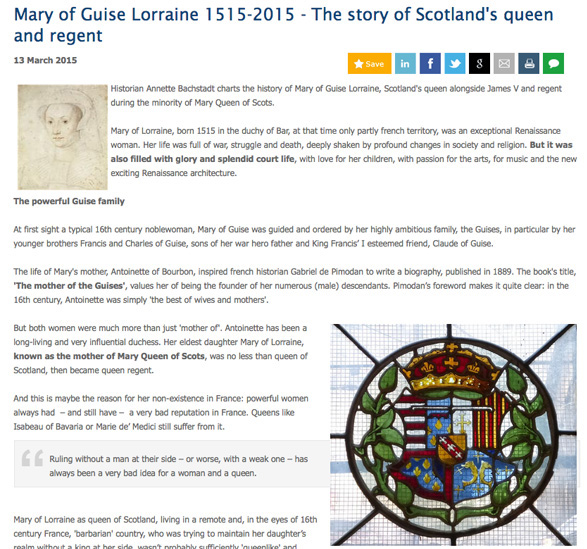 The Mary of Guise-Lorraine article from this blog, recently republished on Celebrate Scotland, features amongst its illustrations the Queen regent’s Coat of Arms on stained glass. These Arms are situated in the middle window in the south wall of the Magdalen Chapel in Edinburgh. The Magdalen Chapel website states that it « was built [more likely founded] between 1541 and 1544 by Janet Rynd, widow of Michael MacQueen (died 1537)« . The Charter of Confirmation dates from 1547: