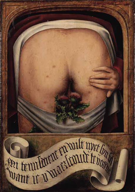 Almost nothing is known about this diptych. Some information can be found on the Wittert Gallery’s website in French and translated here in English. The author of the French description, France Capon, uses very cautious words. The depicted subject is indeed very rare; parallels might be found in the work of Hieronymus Bosch or Quentin Metsys. However, the Liège painting has an undeniably stylistic closeness to these Flemish artists. Capon describes the purpose of the diptych as « moralising » and points out the significance of the thistle as a symbol of defence, of austerity and even misanthropy. All these words describe quite well the character of duchess Philippa. Is it possible that this painting, by its artistic quality as well as its potential humoristic intention that might appear rude and not fitting for a noblewoman today, was intended for a highborn personality such as Philippa?