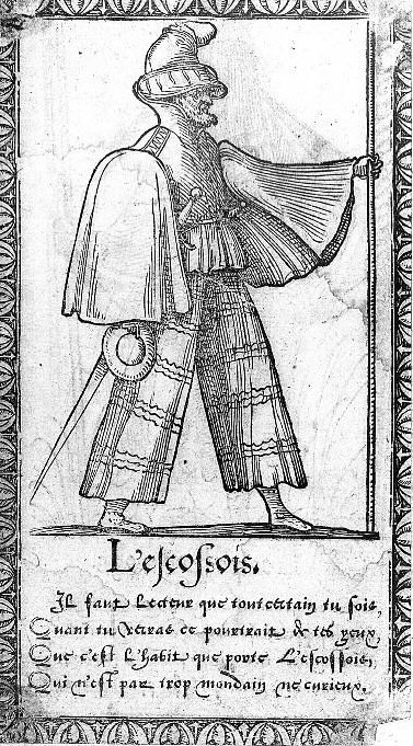 No pictures of any everyday clothes worn in Scotland at the time of Marie’s arrival exist. The earliest images appear in an illustrated book intitled A collection of the various styles of clothing which are presently worn in countries of Europe, Asia, Africa, and the savage islands, all realistically depicted that was first published in Paris in 1562 by François Deserps. Four of a total of 124 engravings in his book concern Scotland and are divided in Lowland and Highland fashion. It might be surprising to some, but the picture of L’escossois or Scot shows no kilt but baggy pants with tartan-like patterns, possibly made of wool, and a short tunic with very large sleeves. The man is bearded and armed with a spear or stick, a dagger, a long sword worn without scabbard, and a buckler. In his description of the engraving, François Deserps notes disdainfully: « he is not worldly nor refined. » However, the Scots headgear looks rather fancy. It is hard to tell if he wears shoes or some sort of tights. Maybe he is simply barefoot.