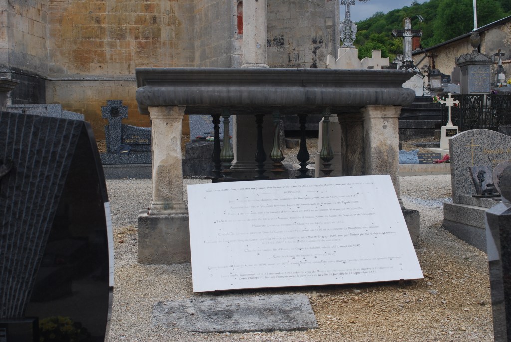 Enfin, le dernier vestige du tombeau du duc et de la duchesse de Guise, la dalle en marbre noir sur laquelle se trouvaient les sculptures des deux défunts, est aujourd’hui au cimetière de Joinville. Sous cette dalle reposeraient notamment les restes de Claude de Lorraine, de sa femme Antoinette et de leur fils aîné François, second duc de Guise. Un simple panneau précise :